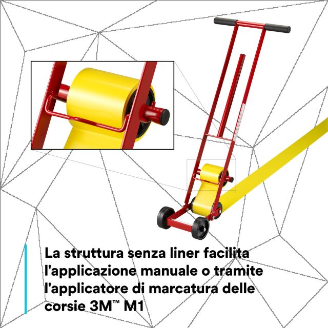 L’applicatore 3M M-1 permette di applicare i nastri di segnaletica come 471, 764, 766 e 767 in modo semplice, preciso e veloce rimanendo in piedi ed evitando di chinarsi sul pavimento. Ideale per l’applicazione dei nastri di segnaletica in magazzini, capannoni, laboratori e, in generale, per superfici di grandi dimensioni.