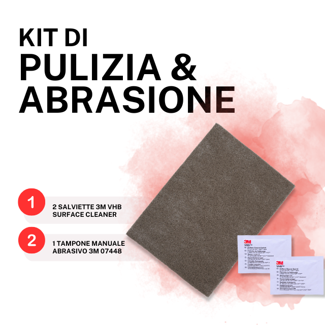 Un pratico Kit Pulizia e Abrasione per piccole superfici metalliche, composto con Prodotti 3M. Include 1 tampone abrasivo 3M 07448 da 158 mm x 224 mm e 2 salviette di 3M VHB Surface Cleaner. Il tampone abrasivo è ultrafine, progettato per la preparazione alla verniciatura e la lavorazione delle superfici metalliche. A differenza della lana d‘acciaio, non si frantuma durante l‘uso, non genera ruggini, né lascia schegge di metallo fini. Invece le salviette monouso sono un detergente multisuperficie, dall’asciugatura immediata. Costituite da una miscela di alcool isopropilico, puliscono e rimuovono dalle superfici qualsiasi tipo di sporco, aloni e impronte, evaporando rapidamente senza lasciare residui.