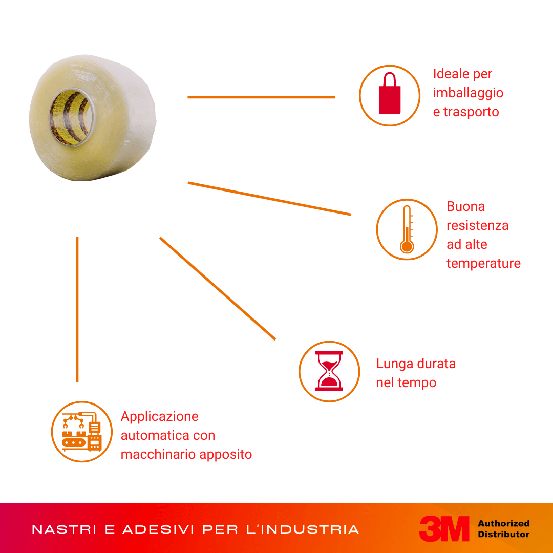 E’ dotato di un supporto in pellicola ScotchPro durevole, molto resistente in direzione longitudinale e di un adesivo hot melt aggressivo e privo di solventi. Il polipropilene mono-orientato ad alta resistenza alla trazione, combinato con l’adesivo appositamente formulato, assicura eccellente adesione alla maggior parte degli involucri di film termoretraibile, assicurando fissaggio immediato e sicuro della maniglia. La struttura del nastro è particolarmente adatta per elevata resistenza al taglio.