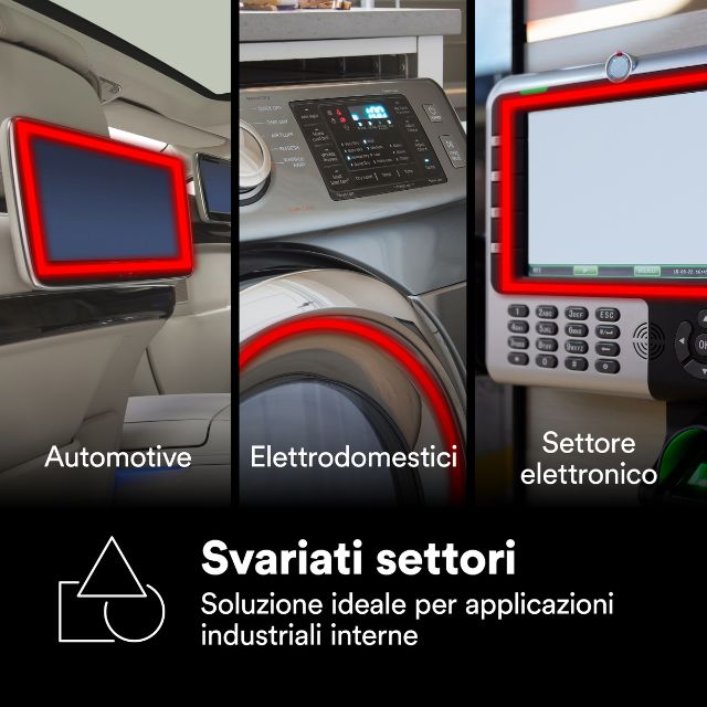 - Incollaggio di materiali compositi, cornice di display LCD, cornici metalliche, pannelli touch e decorativi;