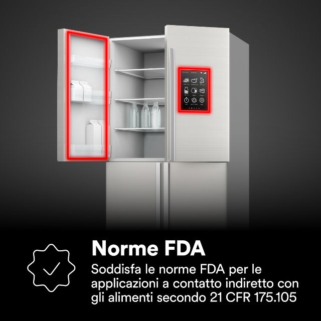 - Adatto anche per applicazioni a contatto indiretto con alimenti, secondo FDA 21 CFR 175.105;