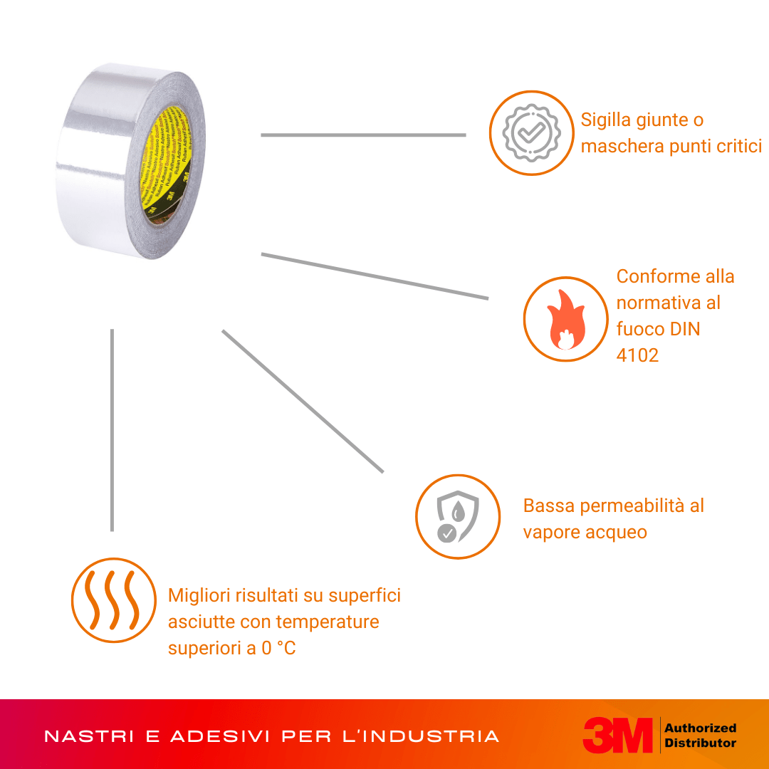 Il Nastro in alluminio 3M 1436 per Usi Generici è un prodotto di alta qualità per lavori di canalizzazione interna ed esterna. Dotato di adesivo in gomma resina trasparente, protetto da un liner in carta siliconica bianca, per una facile applicazione. Risponde alla normativa al fuoco DIN 4102 – B1 – PA 111.2.2126. Spessore 0,075 mm. Lunghezza 50 m.