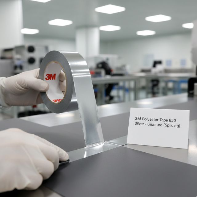 Il nastro in poliestere 3M 850 argento viene utilizzato principalmente per giunture (splicing), marcatura, identificazione e segnalazione di difetti dove è richiesto il rilevamento riflessivo. Dotato di una pellicola in poliestere resistente e un adesivo acrilico trasparente ad alte prestazioni. Spessore totale senza liner: 0,05 mm. Lunghezza: 66 mt.
