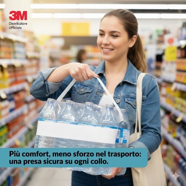 ll nastro 3M 8346, combinato con un inserto in carta personalizzato, crea una comoda maniglia per trasformare imballaggi ingombranti in pacchi facili da trasportare. Progettato per l’integrazione in linee di produzione automatizzate pre-forno, questo nastro ad alte prestazioni, crea una maniglia robusta e confortevole capace di sostenere pesi fino a 9 kg.