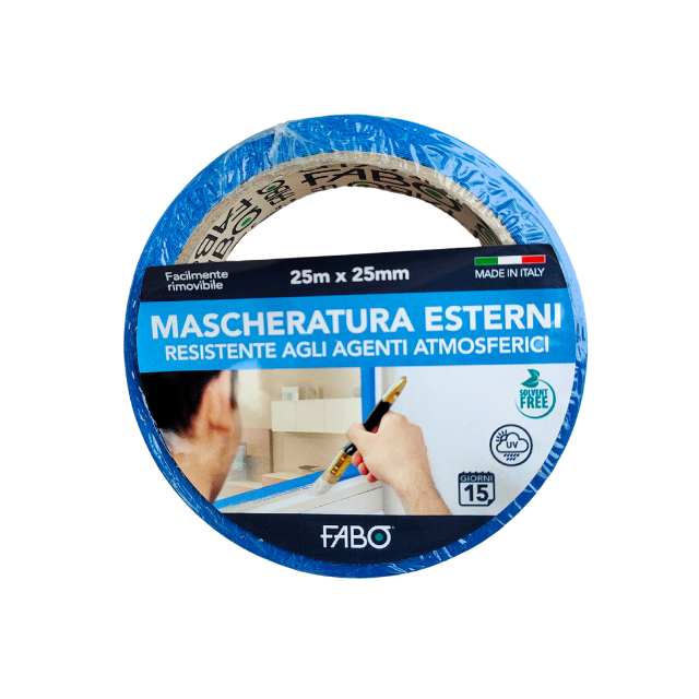 Il Nastro per Mascheratura Professionale per Esterni è specifico per l’uso prolungato in esterni esposti agli agenti atmosferici ed all’irraggiamento solare. Indicato per la mascheratura esterna degli infissi e per uso nei cantieri navali e rimessaggio barche. Il supporto è in carta semicrespata blu, mentre l’adesivo è acrilico base acqua dunque privo di solventi nocivi. Spessore: 0,105 mm. Dimensioni: mm 25×25 mt.