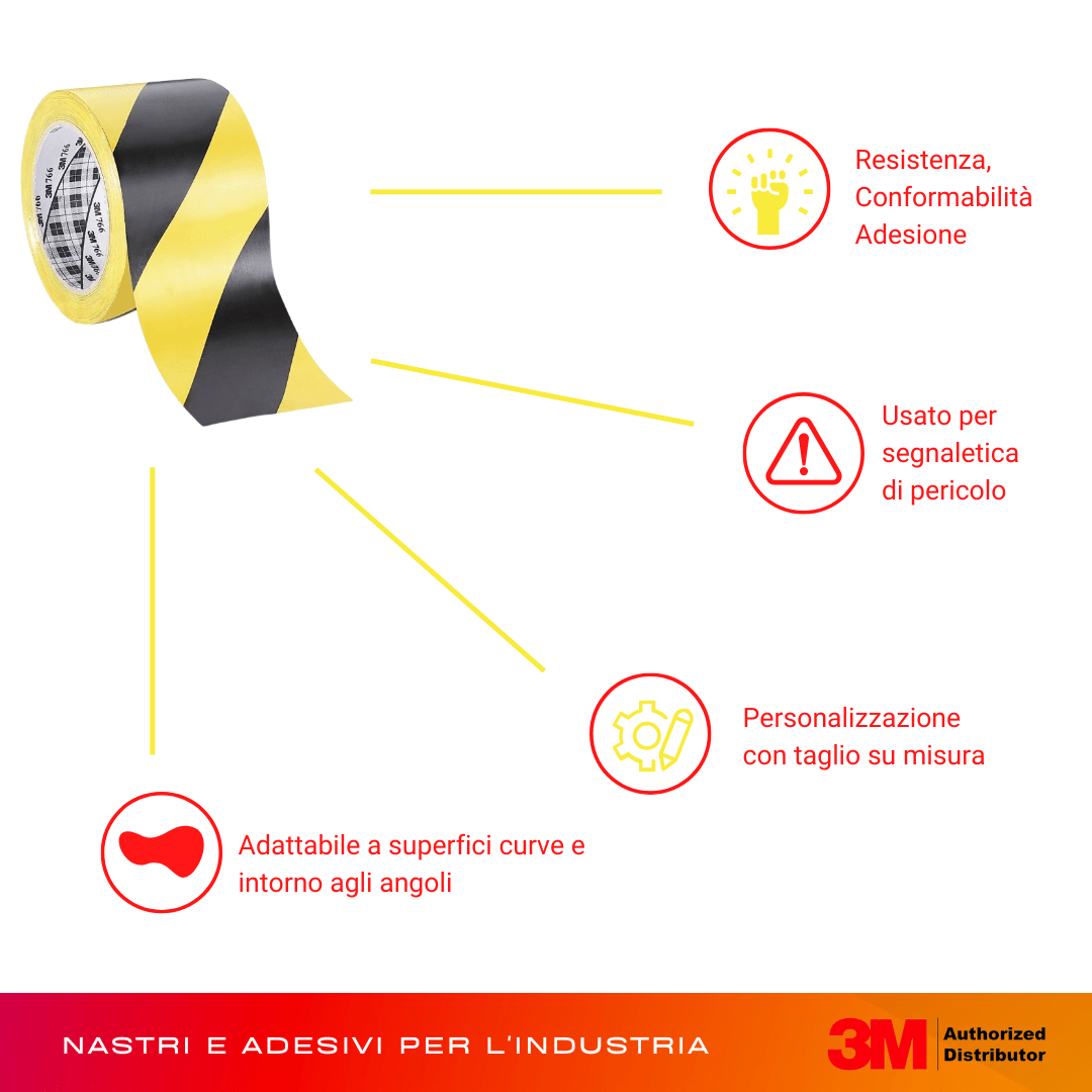 Il nastro vinilico 3M 766 è la soluzione più economica per fornire chiare indicazioni di segnaletica di sicurezza in aree a traffico leggero, su corsie di marcia e pedonali, aree pericolose, attrezzature sporgenti e oggetti sospesi bassi. Colore: bande trasversali gialle e nere. Spessore 0,13 mm.